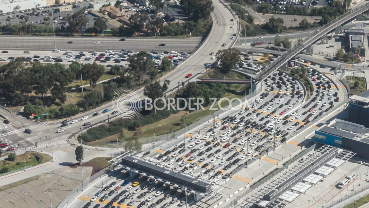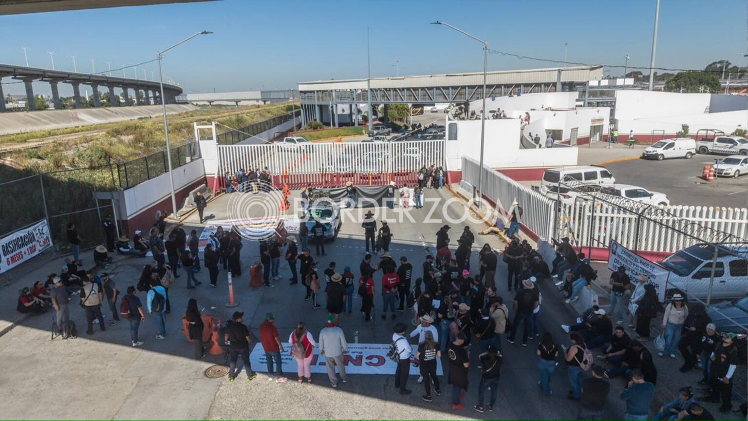 Las imágenes aéreas muestran el tránsito completamente detenido, con vehículos varados mientras docentes de la CNTE se mantenían en la salida de la frontera, impidiendo el paso hacia territorio mexicano.