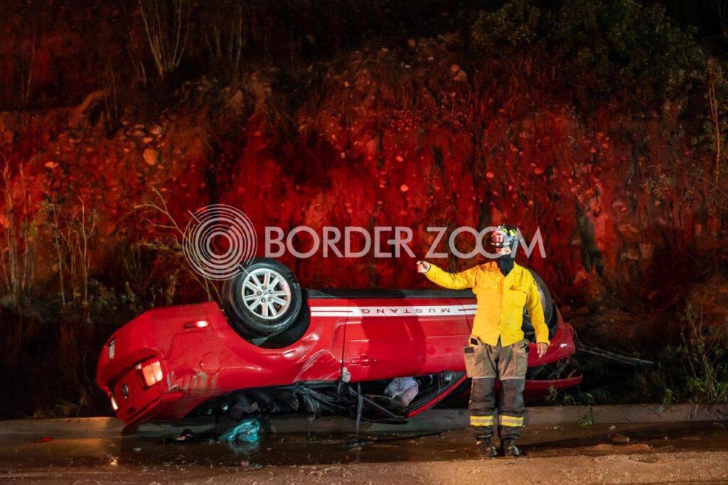 Un Ford Mustang volcó en el libramiento Rosas Magallón la mañana de este martes, a la altura del conocido puente