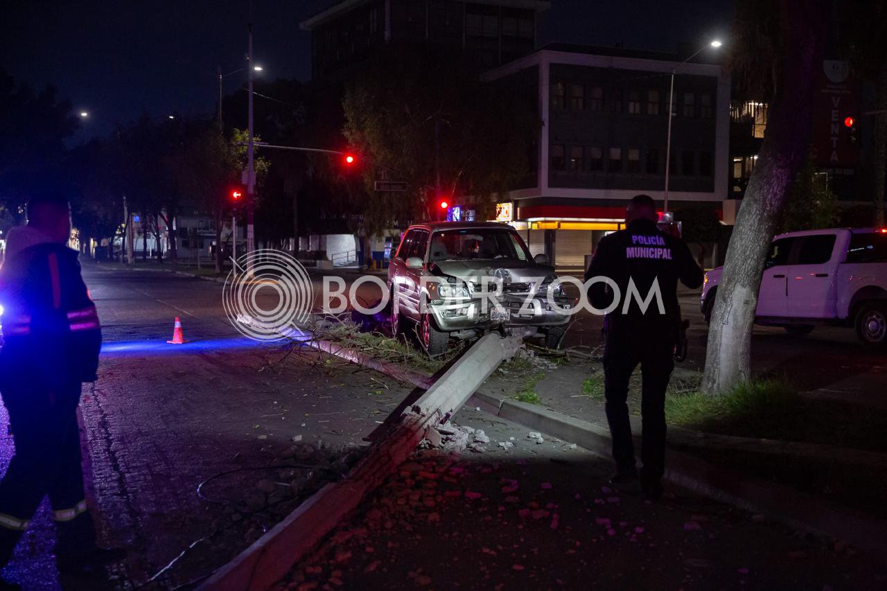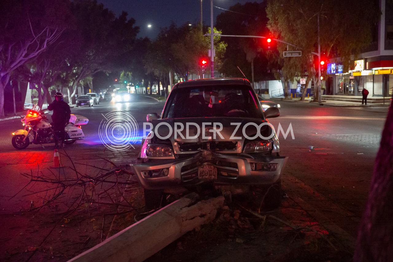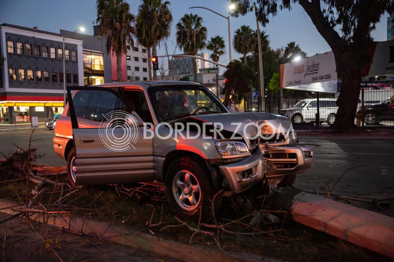 Una camioneta Toyota terminó impactada en el cruce de la avenida Sánchez Taboada y Diego Rivera, justo frente al edificio de la Fiscalía General del Estado, después de derribar un árbol y un poste de alumbrado público.