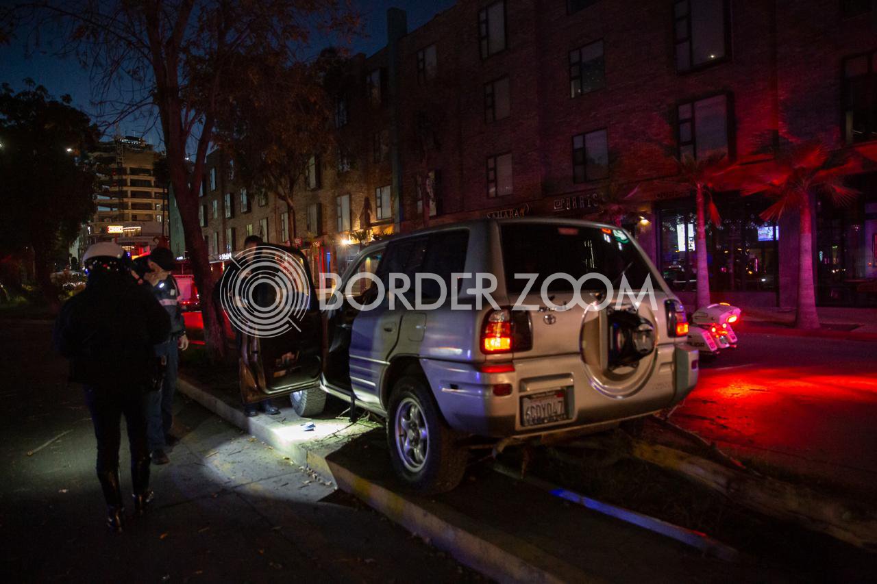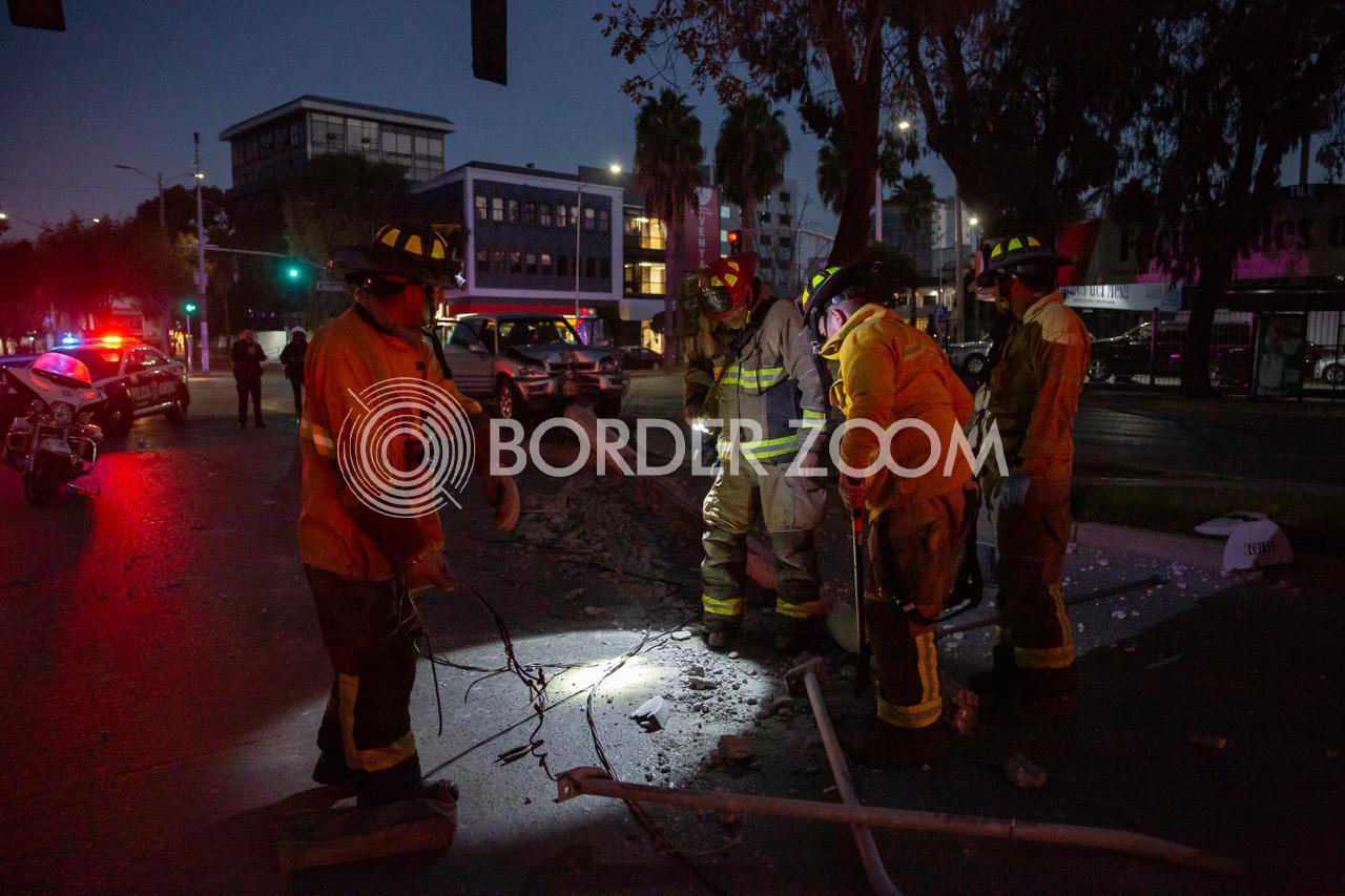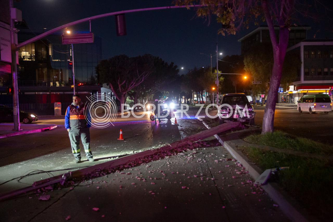 Una camioneta Toyota terminó impactada en el cruce de la avenida Sánchez Taboada y Diego Rivera, justo frente al edificio de la Fiscalía General del Estado, después de derribar un árbol y un poste de alumbrado público.