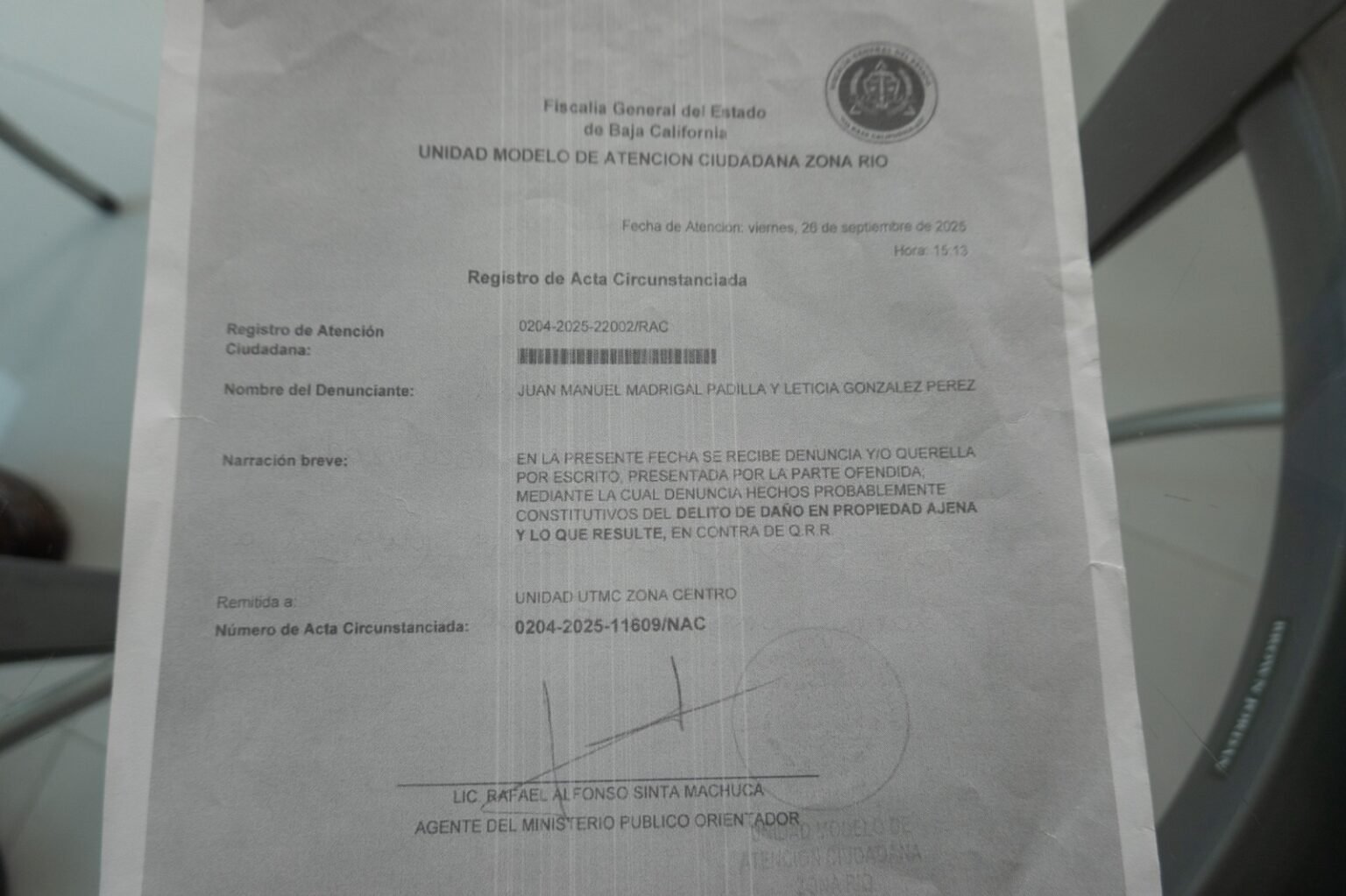 Por su parte, Leticia interpuso una denuncia ante la Fiscalía General del Estado el 26 de septiembre de 2025 por el delito de daño en propiedad ajena y lo que resulte, en contra de quien resulte responsable.