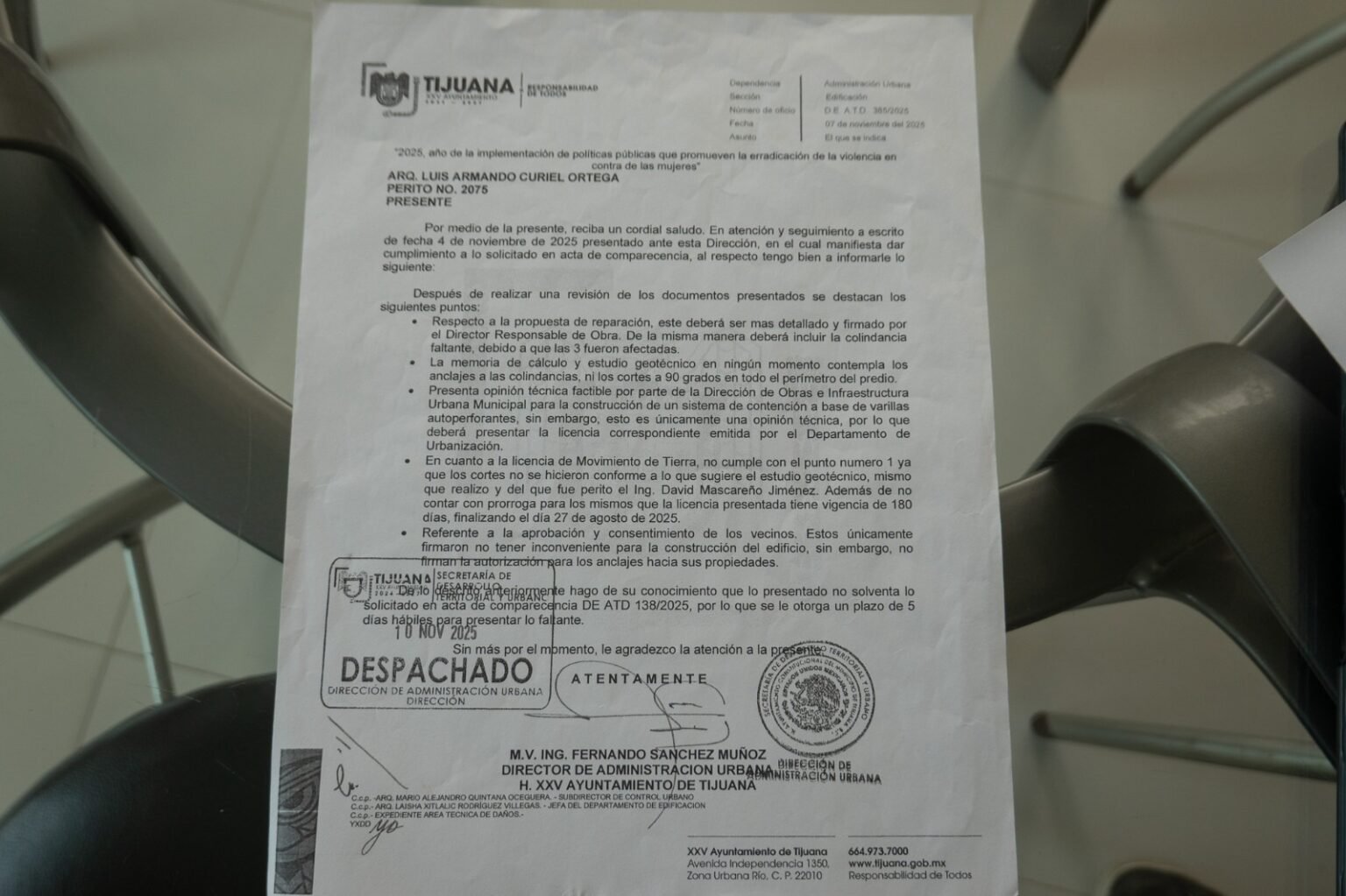 A pesar de que la mañana de este miércoles personal del Ayuntamiento de Tijuana acudió al sitio para clausurar la obra, los residentes afectados exigen a las autoridades municipales que actúen conforme a la ley y se deslinden responsabilidades contra la empresa constructora y los responsables técnicos del proyecto.