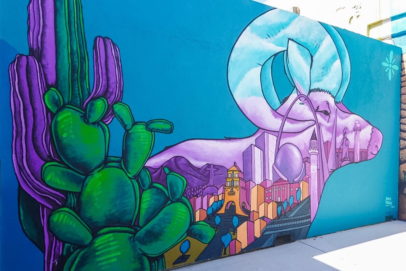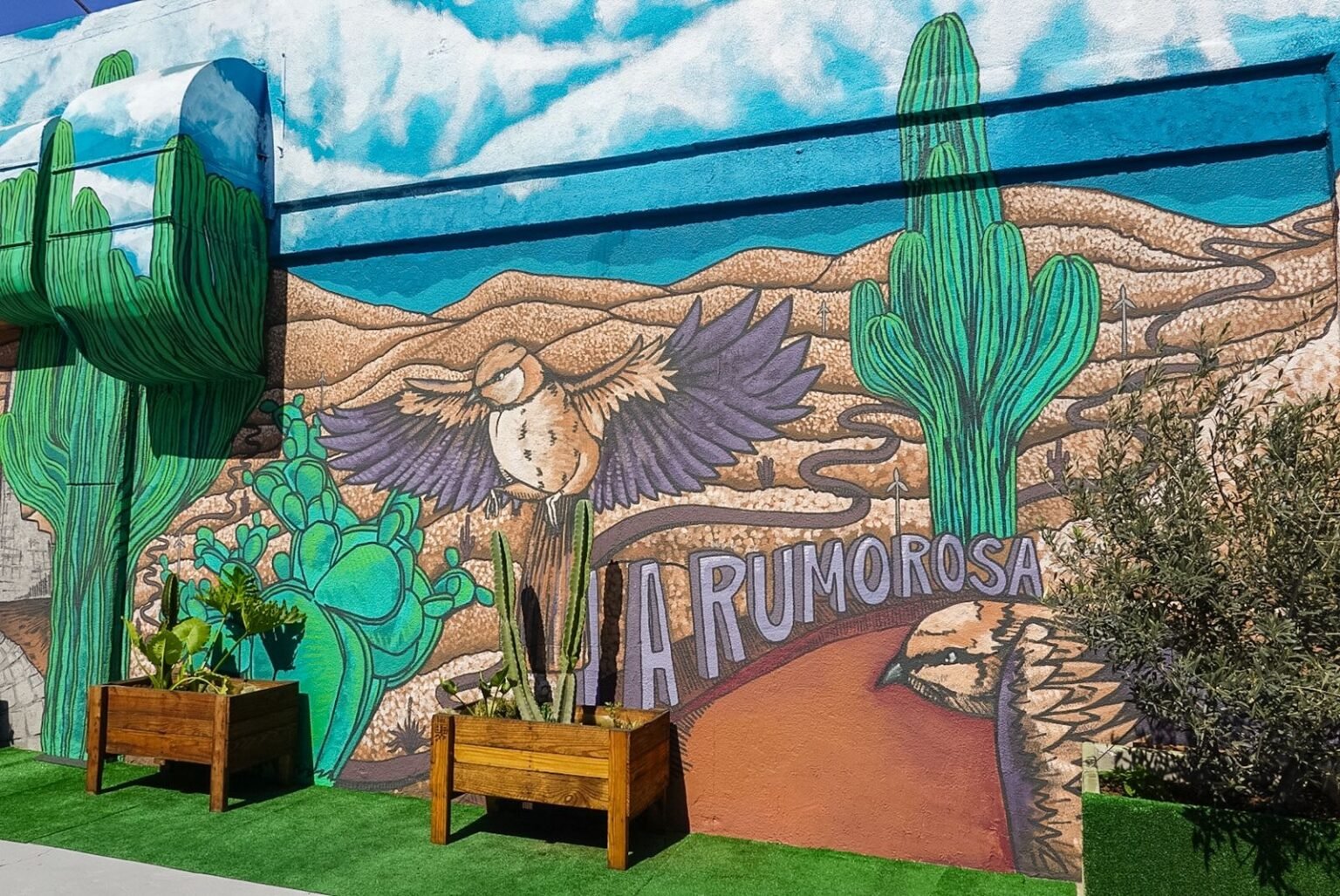 El artista Javier Farrera realizó un mural en la Plaza 5 y 10, ubicada frente a la clínica 20 del IMSS, con el objetivo de acercar a la ciudadanía a uno de los paisajes más emblemáticos de Baja California, La Rumorosa.