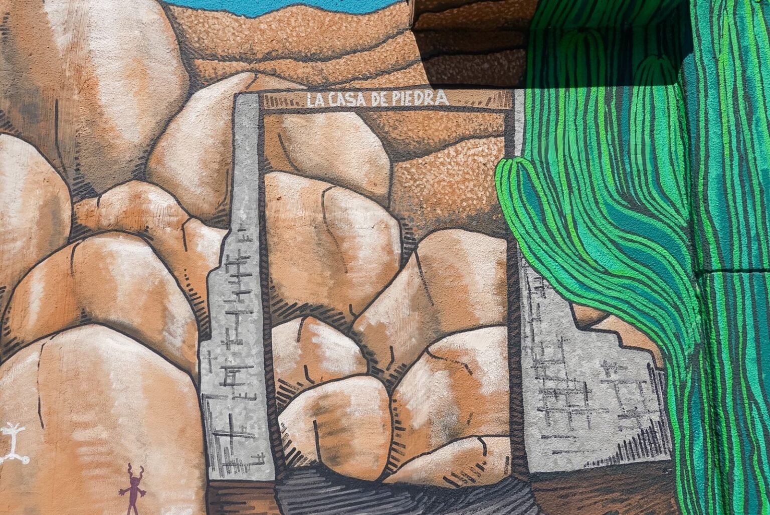 La obra destaca por representar la zona rocosa característica de este sitio, así como elementos que evocan las pinturas rupestres, creando un escenario visual pensado también para que las personas puedan tomarse fotografías.