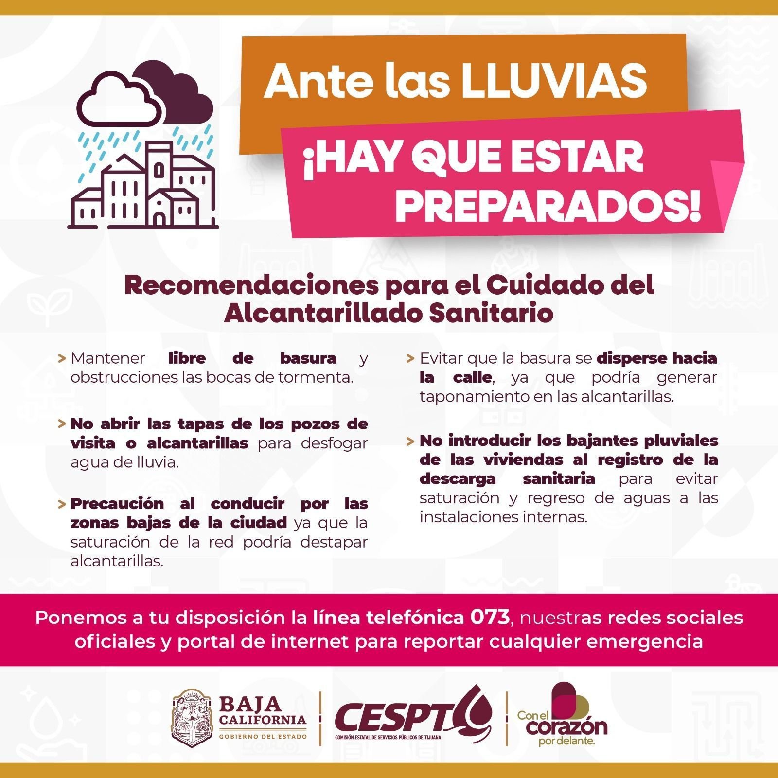 TIJUANA.-Ante el pronóstico de lluvias para la ciudad de Tijuana, la Comisión Estatal de Servicios Públicos de Tijuana (CESPT) emite las siguientes recomendaciones a la ciudadanía respecto al sistema de alcantarillado sanitario, con el propósito de evitar taponamientos en la red.