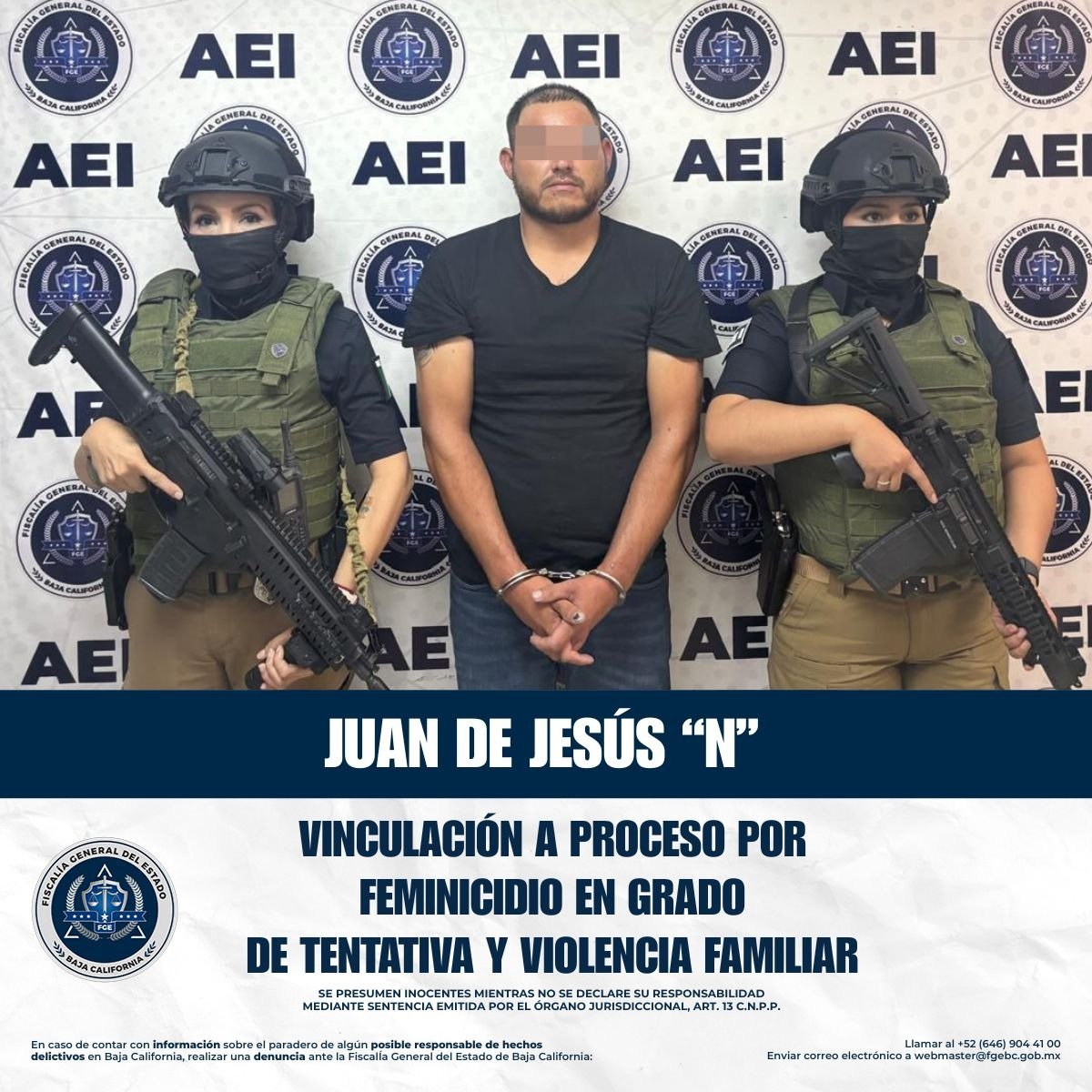 TIJUANA, BAJA CALIFORNIA, A 6 DE OCTUBRE DE 2025.- La Unidad de Investigación de Delitos de Violencia Familiar, La Mesa, adscrita a la Fiscalía Regional de Tijuana, obtuvo la vinculación a proceso en contra de Juan de Jesús “N”, por los delitos de feminicidio en grado de tentativa y violencia familiar, quedando en prisión preventiva justificada como medida cautelar.