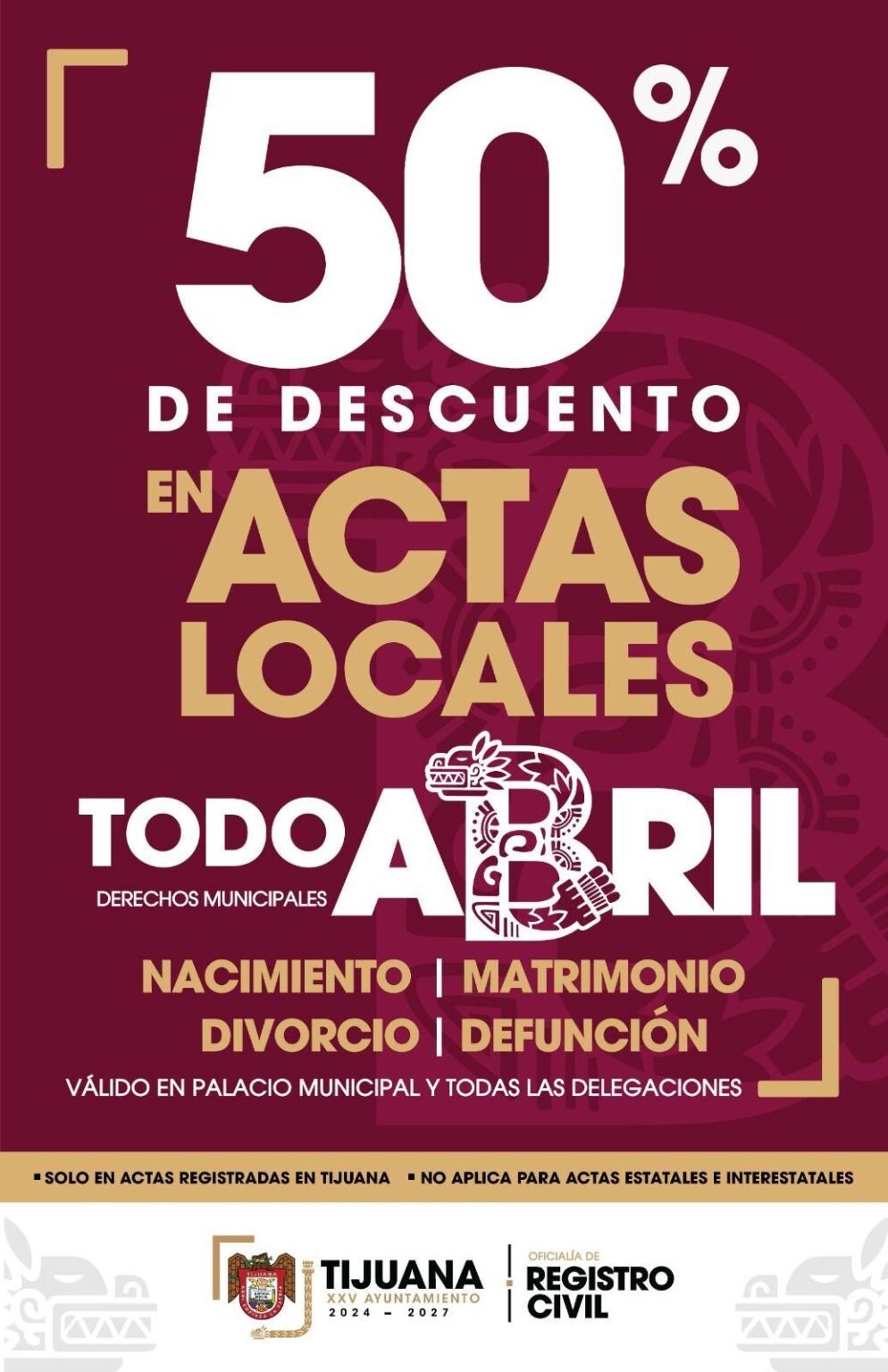 Tijuana, Baja California, a 3 de abril de 2026. El gobierno del presidente Ismael, Burgueño Ruiz, informa a la ciudadanía que durante todo el mes de abril se ofrecerá un 50 por ciento de descuento en actas locales expedidas en el Registro Civil Municipal.