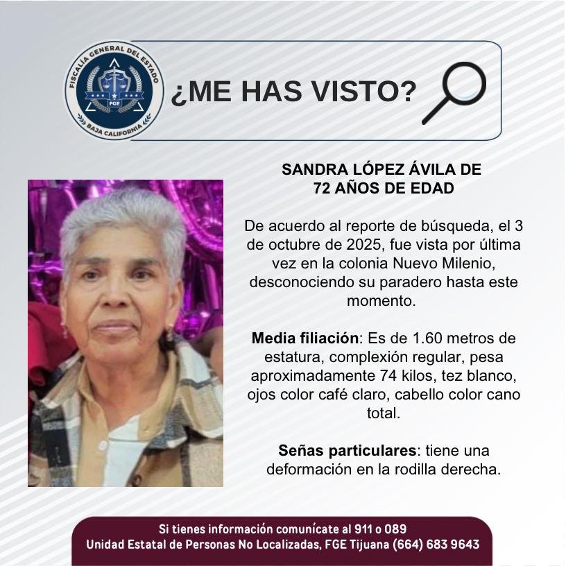 TIJUANA, BAJA CALIFORNIA, A 5 DE OCTUBRE DE 2025.- La Fiscalía General del Estado (FGE), solicita el apoyo de la ciudadanía para localizar a SANDRA LÓPEZ ÁVILA DE 72 AÑOS DE EDAD.