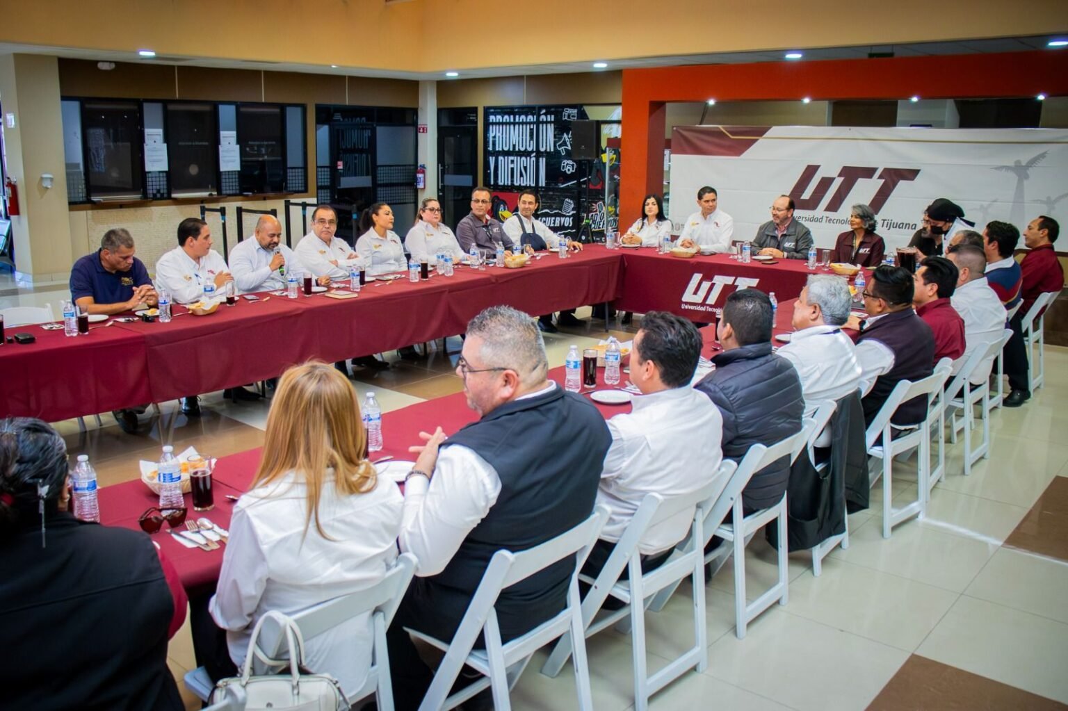 TIJUANA.- Directoras y directores de planteles de CECyTE BC Zona Costa se reencontraron con egresadas y egresados que reciben formación profesional en la Universidad Tecnológica de Tijuana (UTT), como parte de una reunión estratégica para refrendar la relación interinstitucional.
