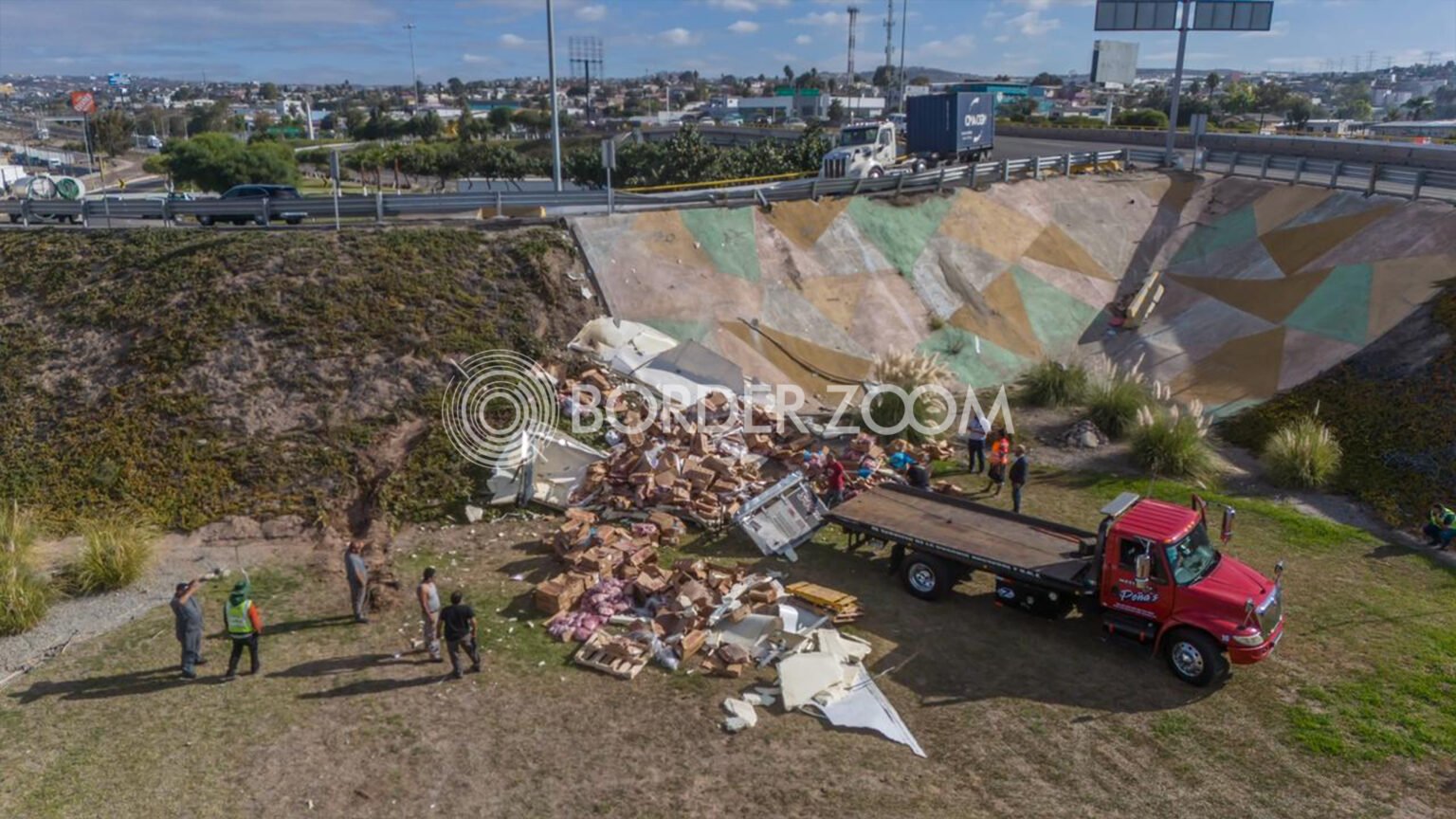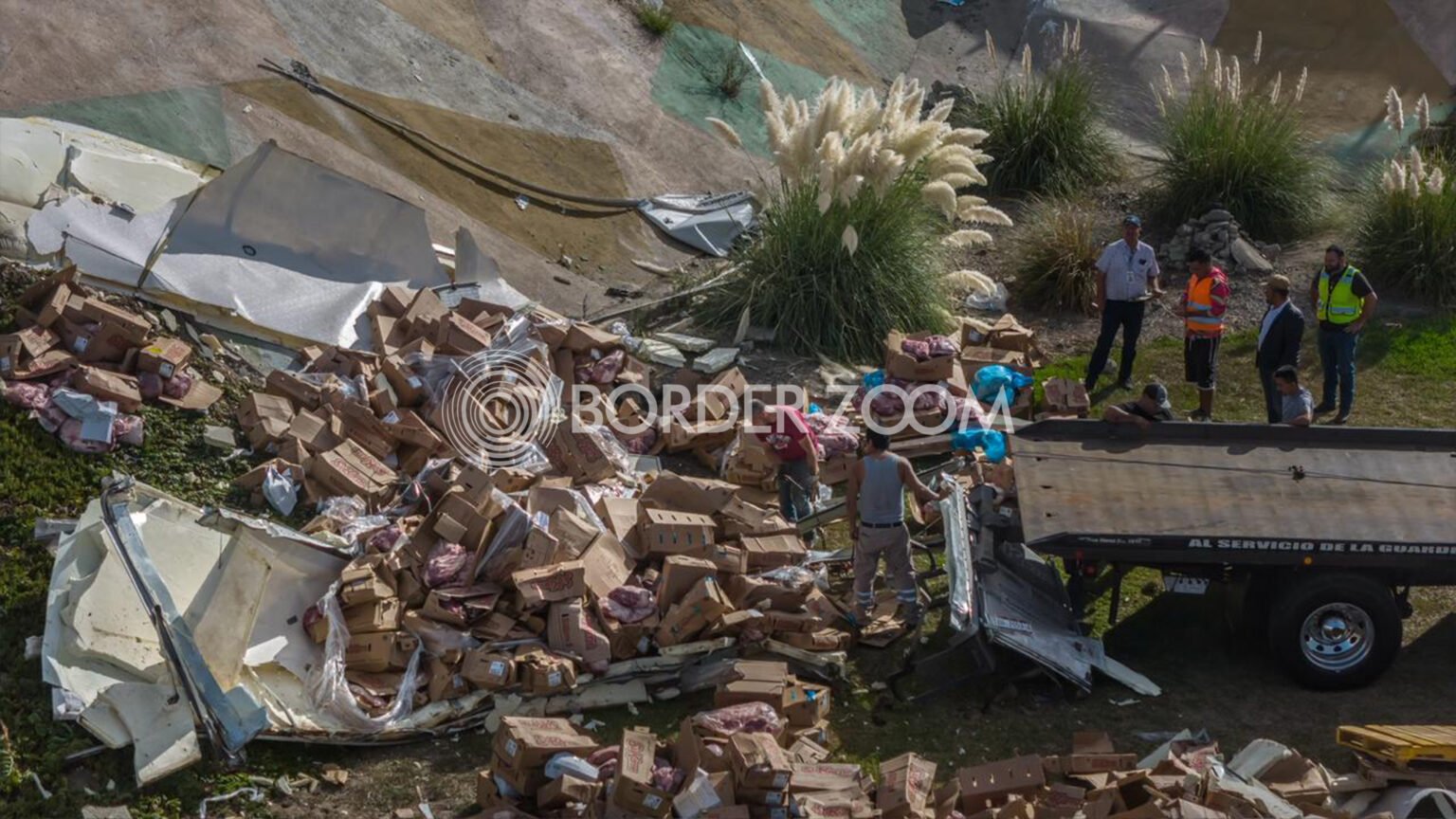 Un tráiler que transportaba carne para la empresa “Su Carne” volcó la mañana de este viernes en la intersección de la gaza que conecta la carretera de cuota Tijuana-Ensenada con la carretera libre, en el municipio de Playas de Rosarito.